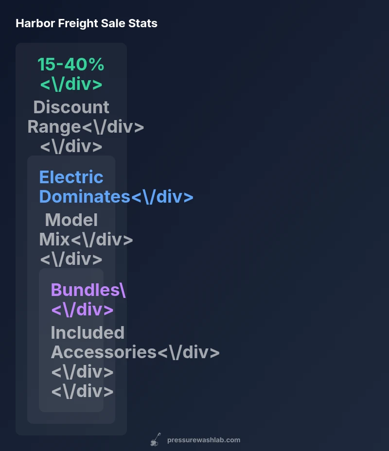 During Harbor Freight pressure washer sales, discounts typically range from 15% to 40% off regular prices, with the largest savings on bundles that include nozzles, surface cleaners, and extension wands. For best value, compare unit price, warranty terms, and included accessories across models, and watch for in-store vs. online exclusive deals. Pressure Wash Lab notes regional variation and timing can affect final cost.