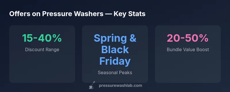 Offers on pressure washers typically appear as percentage discounts off MSRP during major sales events, with electric models often seeing larger markdowns than gas units. Pressure Wash Lab Analysis, 2026 shows typical promotions range from 15% to 40% off, depending on model and retailer. Look for bundles, free add-ons, and extended warranties that boost value beyond the headline price.