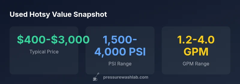 For many homeowners and small businesses, used hotsy pressure washers for sale deliver the best balance between upfront cost and long-term reliability. The Pressure Wash Lab team has found that the best value units are typically 2-6 years old, with documented maintenance history and moderate pump hours. Buyers should weigh initial sticker price against service needs, available parts, and the cost of potential future repairs. When shopping, ask sellers for pump hours, cycle counts, and a record of parts replacements. Gas-powered models generally deliver higher PSI and GPM, but electric units can be cheaper to maintain and operate. Starting with a clear use-case—light driveway cleaning vs. heavy industrial tasks—helps narrow the field and protect your budget. This guide uses Pressure Wash Lab analysis to illustrate typical price bands, common problem areas, and practical checks before purchase.