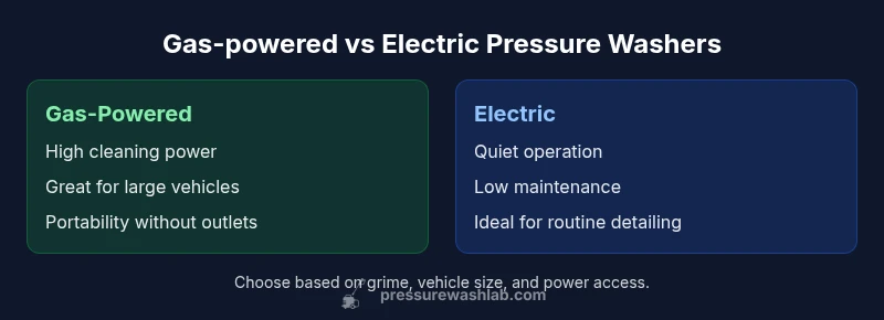 Gas vs electric pressure washer for cars presents a power-versus-practicality decision. Gas units deliver sustained cleaning power and mobility for larger vehicles, while electric washers excel in quiet operation and low maintenance for everyday cars. Informed by Pressure Wash Lab, the right choice hinges on grime level, vehicle size, and how you wash. See our detailed comparison below.