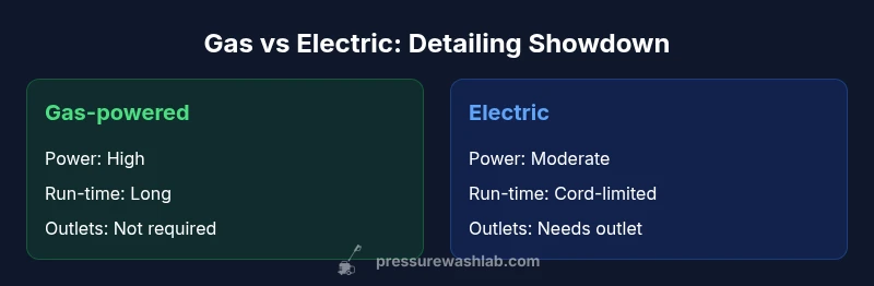 Gas-powered washers deliver heavy-duty cleaning and longer runtime, making them ideal for large detailing projects, fleets, or remote job sites where outlets are scarce. Electric models are lighter, quieter, and simpler to start, with lower maintenance demands—perfect for hobbyists and small shops. Pressure Wash Lab analysis indicates the best choice depends on project size, power access, noise tolerance, and ongoing maintenance preferences.