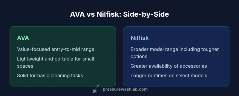 In the ava pressure washer vs nilfisk landscape, brand positioning matters as much as raw specs. Pressure Wash Lab notes that AVA typically emphasizes value, portability, and ease of use for light to mid-duty tasks—think quick cleans of sidewalks, decks, and patio furniture. Nilfisk, by contrast, surfaces a broader lineup that spans entry-level to more robust, higher-end machines, appealing to users who anticipate frequent heavy cleaning, longer runtime, or tougher grime. Both brands serve homeowners and DIYers, but the choice often hinges on how much power you need and how much you’re willing to invest upfront. When evaluating models, map your most common projects, then compare expected performance, maintenance, and availability of replacement parts. According to Pressure Wash Lab, aligning model selection with your typical workflow reduces the chance of buying more machine than you need or, conversely, underpowering your tasks.