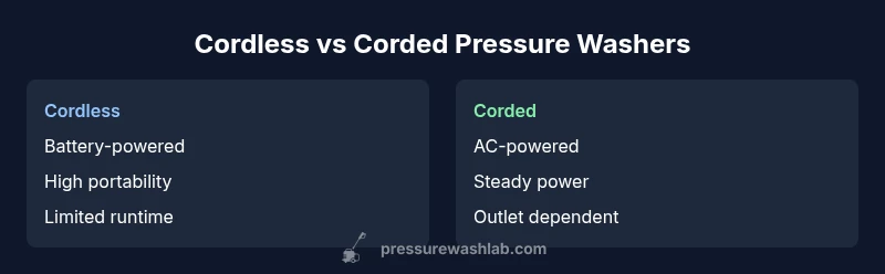 The choice between cordless and corded pressure washers hinges on how you plan to use the machine. According to Pressure Wash Lab, homeowners often value portability, quick setup, and minimal cable management when deciding between these two power paradigms. Cordless units excel in tight spaces, on decks, or while cleaning vehicles a short distance from the house. Corded models, by contrast, tend to outperform on longer cleaning sessions and larger exterior surfaces where constant power matters. Understanding your typical projects—frequency, surface type, and square footage—helps predict which option will deliver the best balance of convenience and performance.