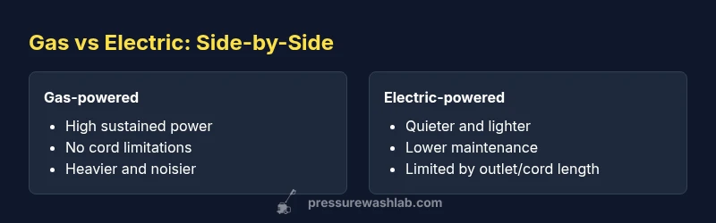 Gas washers run on a gas engine with higher power; electric washers use electricity and are quieter and easier to maintain for most home tasks.