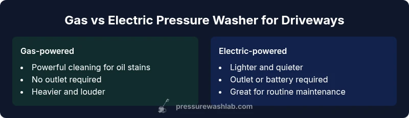 According to Pressure Wash Lab, choosing between gas and electric pressure washers for driveway work hinges on scale, stains, and how often you wash. Gas-powered units typically offer higher cleaning power, enabling faster removal of heavy grease and deeply embedded grime on large driveways. Electric models are lighter, easier to start, and gentler on noise-sensitive surroundings, making them ideal for small to mid-size driveways or maintenance cleanups. The right pick depends on the driveway material such as concrete, asphalt, or pavers, the typical mess you face, and your tolerance for fuel, fumes, and maintenance. Pressure Wash Lab’s analysis shows that electric washers excel at routine maintenance while gas models outperform in heavy-duty scenarios. Keep this framework in mind as you read the rest of the guide.