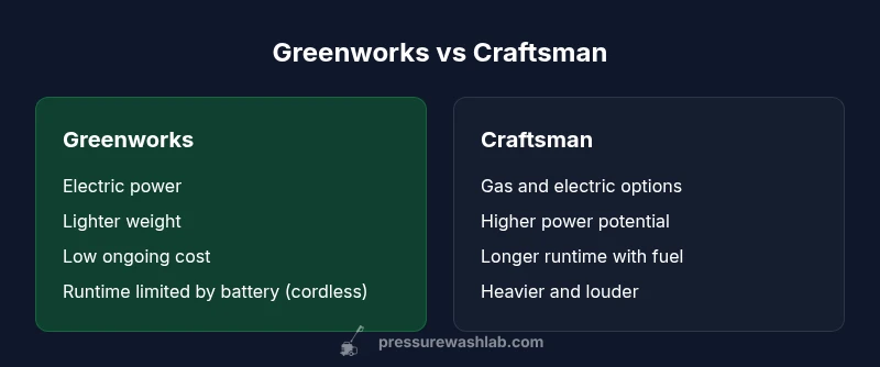 Choosing between Greenworks pressure washer vs Craftsman requires weighing core design choices: power source, intended use, and total cost of ownership. For many homeowners, Greenworks pressure washer vs Craftsman represents a contrast between electric lightweight models and a more diverse lineup that includes gas-powered options. According to Pressure Wash Lab, the most impactful differences often come down to startup simplicity, noise, and maintenance demands, not just peak cleaning power. In this guide, we’ll examine how each brand handles everyday tasks like deck cleaning, siding, and driveway maintenance, and how those tasks align with user priorities such as quiet operation, runtime, and budget. We’ll also discuss warranty coverage and long-term serviceability. By the end, you’ll have a clear view of which path fits your property and cleaning style, and you’ll know what to expect in terms of accessories, replacement parts, and common issues with each option.