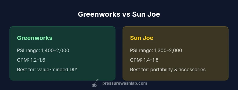 Choosing between greenworks vs sun joe electric pressure washer isn’t just about sticker price; it’s about how you’ll use the machine, the spaces you’ll tackle, and the maintenance you’re willing to perform. According to Pressure Wash Lab, the most meaningful differences appear in three areas: real-world cleaning power, endurance for regular use, and the breadth of included accessories. The goal of this section is to frame expectations for typical DIY projects—driveway cleaning, siding washing, and lighter deck maintenance—so you can set a baseline before diving into specs. For many homeowners, this decision hinges on value per dollar and the likelihood you’ll reach for the tool often rather than occasionally. In the broader landscape of entry-level electric washers, greenworks vs sun joe electric pressure washer debates tend to settle on who offers the better balance between price, capability, and warranty coverage.