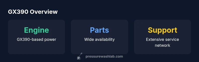 The GX390 is a large, reliable four-stroke engine used in many pressure washers, with a wide parts and service network for easy maintenance.