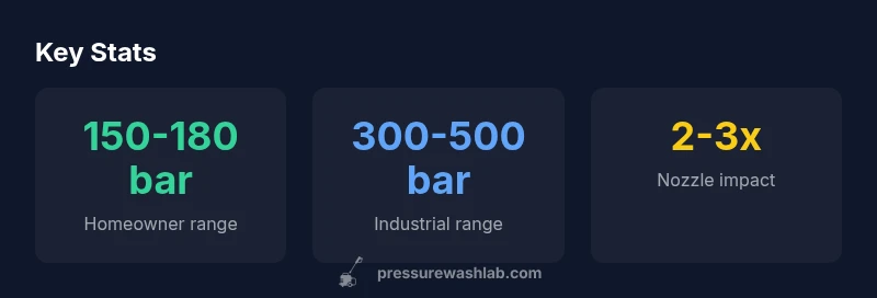 In consumer-grade machines, you typically see ratings in the 100–180 bar range (about 1,450–2,600 psi). These units prioritize portability and ease of use, often with modest GPM. Industrial or commercial units push higher, commonly into the 250–500 bar zone (3,600–7,250 psi), where robust pumps and enhanced cooling are required. Pressure Wash Lab Analysis, 2026 suggests that for most homeowner tasks such as siding, decks, and cars, mid-range pressure with adequate flow delivers the best balance of effectiveness and safety. The highest bar matters most for heavy graffiti removal, tough concrete stain removal, and large-scale surface prep where heavy-duty equipment is warranted.