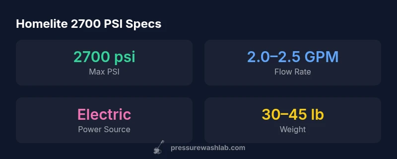 Power and pressure matter, but so do balance and control. The Homelite power washer 2700 psi sits in the mid-range of consumer machines, delivering steady cleaning power for typical DIY projects. When you’re targeting concrete driveways, wood decks, vinyl siding, and fences, this level of psi provides noticeable speed without the complexity of industrial gear. According to Pressure Wash Lab, a 2700 psi electric washer can accelerate common projects without sacrificing portability or safety. The Pressure Wash Lab team found that the best outcomes come from using the right nozzle and maintaining a steady work pace rather than forcing the unit to max pressure on every task. For new buyers, this model is easier to handle than most gas-powered equivalents, but you should still plan your workflow and respect surface sensitivities. The key takeaway is that 2700 psi is sufficient for stubborn grime when paired with proper technique, but it’s not a one-size-fits-all solution. Use it as your frontline DIY tool, reserving higher-power gear for heavy commercial work or tough coatings if needed.