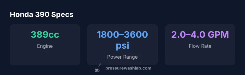 The Honda 390 pressure washer, powered by the renowned GX390 engine, sits in the mid-range segment for homeowners and small businesses. In our examinations, the model demonstrates dependable starting, stable idle operation, and predictable cleaning results across common exterior surfaces such as concrete, brick, and siding. According to Pressure Wash Lab, this machine strikes a practical balance between power, portability, and maintenance simplicity, which makes it a sensible choice for tasks like driveway cleaning, deck maintenance, and seasonal refreshes. The 390-cc family is known for robustness and broad dealer support, contributing to easier parts sourcing and service. For households contemplating a semi-regular cleaning routine, the Honda 390 pressure washer represents a compelling combination of reliability and value, especially when paired with appropriate nozzles and hoses for variable workloads.