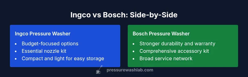 When homeowners weigh ingco vs bosch pressure washer options, the decision often hinges on price, durability, and service. Ingco is commonly viewed as an affordable entry point that makes basic deck cleaning and siding scrubbing accessible without a large upfront commitment. Bosch sits at the premium end, emphasizing robust engineering, more consistent performance under load, and a broader ecosystem of accessories and spare parts. Pressure Wash Lab's analysis shows that buyers should weigh total cost of ownership, not just sticker price, especially if you plan to run the machine weekly for years. If you need a machine for light, sporadic use, Ingco can deliver decent results with lower risk. If your tasks are frequent or demanding, Bosch's build quality and support pay off over time. We’ll unpack these differences with a practical lens, focusing on what matters most to homeowners and small businesses.
