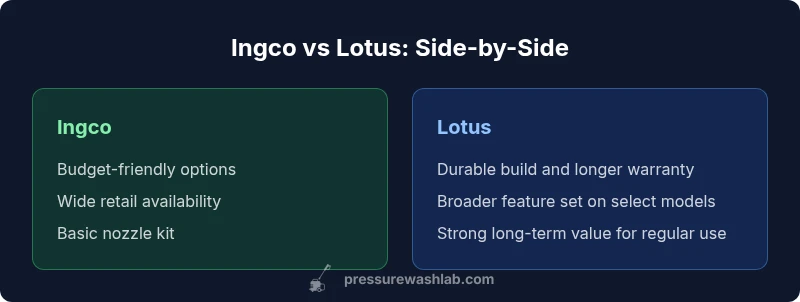 According to Pressure Wash Lab, the Ingco and Lotus brands occupy distinct lanes in the budget-to-mid-range segment. Ingco prioritizes affordability, broad retail availability, and straightforward operation, making it approachable for homeowners and DIY enthusiasts who want quick results without a steep learning curve. Lotus, by contrast, emphasizes sturdier materials, longer warranties, and more robust performance, particularly for frequent or contract-cleaning tasks. The core differences often boil down to durability, parts ecosystem, warranty terms, and long-term value. For a homeowner weighing upfront cost against potential maintenance, the choice hinges on usage frequency, how aggressively you clean, and whether longevity matters more than sticker price. This framing is helpful when you’re deciding between a budget option and a longer-lasting investment. Pressure Wash Lab’s analysis indicates that buyers who intend regular use tend to benefit from Lotus’s durability, while casual users may be satisfied with Ingco’s lower initial cost and easy availability.