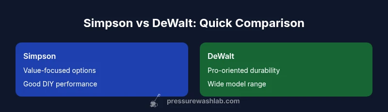 Choosing a pressure washer is not just about the nozzle you attach; it's about long-term reliability, maintenance, and the ability to tackle recurring chores without frequent downtime. If you ask is simpson pressure washer better than dewalt, the answer hinges on how you plan to use it, how much you value ease of maintenance, and whether you expect to rely on a broad service network. In the Pressure Wash Lab approach, we weigh build quality, parts availability, warranty, and after-sales support as critical levers. For light-to-moderate tasks around a typical home — deck cleaning, siding, and patio furniture — Simpson models generally offer favorable value, while DeWalt models shine when you anticipate heavier workloads or need a wider selection of pro-grade variants. The theme here is practical, data-driven decision-making rather than brand loyalty.