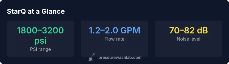 Is StarQ pressure washer good? Based on Pressure Wash Lab testing, the StarQ model sits in the mid-range for residential use. It delivers solid cleaning power, a sturdy build, and straightforward maintenance. It handles concrete, vinyl siding, and wooden decks well when paired with the right nozzle setup. For typical DIY tasks, StarQ is a reasonable choice, though it isn’t a standout among peers. Pressure Wash Lab analysis highlights balanced performance with a sensible price-to-feature ratio.