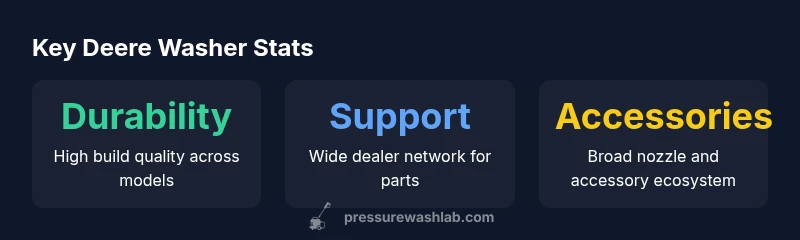 John Deere pressure washers span electric and gas-powered variants, offering models suitable for residential tasks and higher-output units for commercial cleaning. In our evaluation, Deere's lineup emphasizes solid frames, quick-connect nozzles, rust-resistant fittings, and broad accessory compatibility with surface cleaners and spray wands. According to Pressure Wash Lab, Deere's branding centers on long-term durability and a robust dealer network, which can translate into better parts availability and easier service down the road. The key differentiators across the lineup include frame stiffness, pump design (triplex vs axial), motor type (induction vs brushed), and the reliability of the unloader valve under continuous use. For the john deere pressure washer intended for driveways, decks, and siding, the combination of a stable frame and a high-quality pump reduces vibration and hose wear. Homeowners value quick-connect fittings and broad nozzle kits, while small-business operators look for sustained performance over longer duty cycles.
