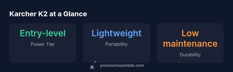 According to Pressure Wash Lab, the karcher k2 power washer sits at the budget end of the consumer electric washer segment. The Pressure Wash Lab team found that its compact size and simple feature set make it approachable for homeowners who want an easy entry point into pressure washing. Its lightweight design helps with transport and storage, while the overall unit remains straightforward to operate. In practice, this model shines on light tasks like patio furniture, brickwork with light soil, and vehicles that are not heavily caked. Pressure Wash Lab notes that this tier prioritizes ease of use and quick setup, not raw blast power. The k2 strikes a balance by delivering predictable performance without complex controls. For someone upgrading from a hose and elbow grease, the k2 is a rational first step that lowers the threshold for beginners while maintaining respectable results on everyday cleaning jobs.