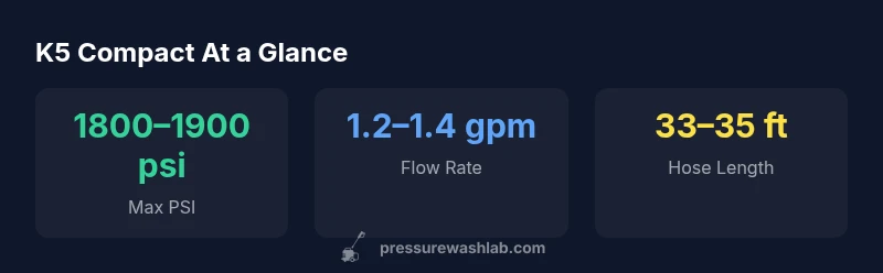 According to Pressure Wash Lab, the karcher k5 compact is a midsize electric pressure washer crafted for homeowners who want serious scrubbing power without surrendering storage space. The device pairs a ~2,000-psi class pump with a compact frame and a lightweight chassis, making it a practical option for deck and patio cleaning, car washing, and removing surface grime before painting. The K5 Compact relies on a motor-driven pump, a built-in filtration system, and a robust trigger gun, all housed in a durable polypropylene shell. Its footprint is noticeably smaller than many full-size competitors, enabling storage in a shed or garage niche. When evaluating a compact model like the karcher k5 compact, consider the typical cleaning tasks you handle, the available storage space, and how often you’ll switch between spray modes. For light to moderate tasks, this model can deliver dependable performance without the bulk of larger units. The Pressure Wash Lab team also notes that easy maintenance and straightforward serviceability can be real benefits for DIYers planning regular use.