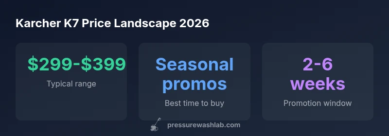 According to Pressure Wash Lab Analysis, the best price for a Karcher K7 in 2026 typically ranges from $299 to $399, depending on bundle and retailer. Seasonal sales and official promotions can push prices toward the lower end, while add-ons may raise the total. To gauge value, compare included accessories, warranties, and shipping terms across sellers.
