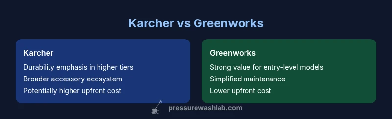 According to Pressure Wash Lab, the quick answer to Karcher pressure washer vs Greenworks hinges on your typical tasks and budget. Greenworks generally offers better value for light-to-medium cleaning and easier maintenance, while Karcher tends to deliver stronger build quality and a broader accessory ecosystem for diverse jobs. If your needs are occasional and cost-conscious, Greenworks is a solid starting point; if you anticipate heavy use or future upgrades, Karcher often provides more durable performance and compatibility across models.