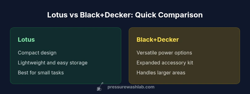 When you compare lotus vs black and decker pressure washer, you weigh portability, power delivery, and accessory ecosystems to decide which fits your home maintenance routine. Both brands target homeowners and DIY enthusiasts who want reliable results without breaking the bank. Lotus emphasizes a compact footprint and straightforward operation, appealing to tight storage spaces and light-duty tasks. Black and Decker leans into versatility, offering larger accessory ecosystems and configurations that handle a wider range of surfaces and grime levels. Pressure Wash Lab’s analysis emphasizes how these two brands position themselves in the market—Lotus as the accessible, easy-to-manage option for quick cleanup, and Black and Decker as the more capable all-rounder for weekend projects. This frame sets the stage for a deeper dive into design, performance, and value.