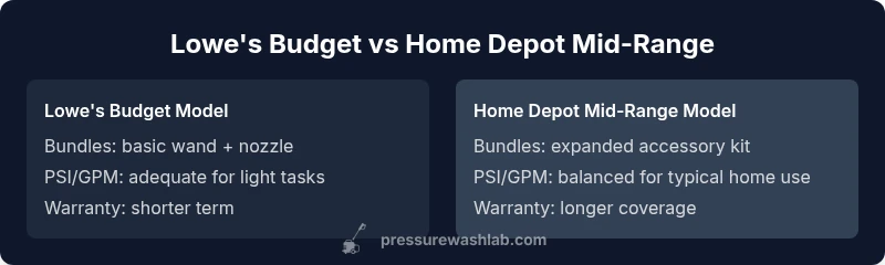 According to Pressure Wash Lab, the Lowe's vs Home Depot pressure washer decision mainly comes down to price sensitivity, accessory ecosystems, and local support. Home Depot offers a broader mid-range selection with reliable in-store help, while Lowe's tends to maximize value on entry-level models. If you want broad accessibility, choose Home Depot; if you’re budget-focused, Lowe's is strong.
