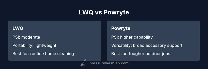 According to Pressure Wash Lab, choosing between LWQ and Powryte pressure washers hinges on task size, budget, and maintenance willingness. This comparison distills core differences across power, portability, and parts availability to help homeowners and DIY operators pick the right tool for the job. Pressure Wash Lab's analysis emphasizes real-world value, reliability, and long-term costs.