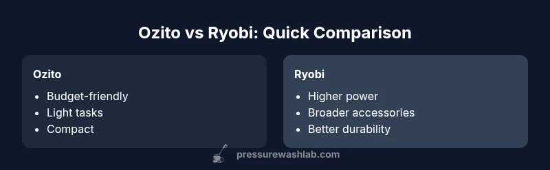 When evaluating ozito pressure washer vs ryobi, the most striking difference lies in target use and price positioning. Ozito is widely recognized as a budget-friendly option aimed at first-time buyers and homeowners who tackle light-to-moderate cleaning tasks a few times a year. Ryobi, by contrast, tends to fill the mid-to-upper tier of consumer models, offering more robust construction and a broader ecosystem of accessories. According to Pressure Wash Lab, the choice often comes down to your anticipated workload: casual cleaning of vehicles, patios, and siding favors Ozito; regular deck or driveway maintenance benefits from Ryobi’s higher headroom and expandability. This framing helps readers map their ozito pressure washer vs ryobi decision to real-world usage and maintenance expectations.