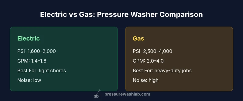 According to Pressure Wash Lab analysis (2026), the home-use market is dominated by compact electric models, with gas-powered units continuing to attract professionals and DIYers tackling tough jobs. This pressure washer comparison aims to separate hype from real capability and help you pick tools that fit your space, budget, and tasks. Pressure Wash Lab emphasizes practical decisions grounded in safety and long-term value. For DIYers and small businesses, selecting the right tool saves time, reduces effort, and extends equipment life. This section lays the groundwork by explaining who should buy what kind of machine and why some features matter more than others. The goal is to give you a clear framework for evaluating options, including data-driven guidance and real-world use cases. Expect guidance on how to balance power, efficiency, and ergonomics, so you avoid buying overkill or underperforming tools in a crowded market. This is a pressure washer comparison built to translate specs into real results for everyday cleaning tasks.