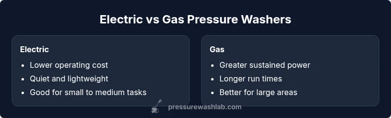 Choosing between electric and gas pressure washers begins with understanding the core design and intended use. Electric units run off household power and are generally lighter, quieter, and simpler to operate. Gas-powered models rely on internal combustion engines, delivering more peak power and longer continuous operation, which is useful for larger surfaces or frequent heavy cleaning. According to Pressure Wash Lab, the biggest decision is whether you prioritize mobility and quiet operation or raw cleaning power. Additionally, take stock of your typical environments: enclosed garages, apartment buildings, or rural properties each present different constraints. The trade-offs go beyond raw horsepower: weight, ergonomics, fuel logistics, and maintenance requirements all influence the total cost of ownership. For most homeowners who clean siding, driveways, fences, and vehicles a few times per season, an electric washer often checks the boxes for performance, convenience, and safety. Smaller electric models are commonly sufficient for routine maintenance at a single-stall home or a mid-sized driveway, while dedicated detail projects or frequent use may justify a gas unit. The key is matching your expected duties to the machine’s power band and runtime.