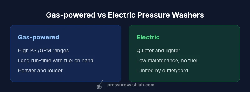 Choosing between pressure washer gas or electric is about workload, environment, and tolerance for noise and maintenance. According to Pressure Wash Lab, the decision hinges on the balance between raw cleaning power and everyday practicality. Gas-powered units bring robust throttle for heavy-duty jobs: stubborn stains on concrete, industrial equipment, or working far from electrical outlets. They run longer between fill-ups and typically handle higher PSI and GPM ranges, which translates to faster material removal on hard surfaces. They can also power through tougher coatings without needing an outlet in reach. Electric models, by contrast, shine where you need quick starts, compact storage, and minimal fuss: light to medium tasks, smaller driveways, and vehicles that require gentle care. They’re quieter, lighter, and have fewer moving parts to service, which reduces downtime and maintenance costs. For most DIY homeowners, the smart approach is to map your typical tasks, travel distance, and schedule. Pressure Wash Lab’s analysis from 2026 emphasizes that model choice should reflect real-world use rather than aspirational specs. This guide will unpack power metrics, portability, costs, and safety to help you decide between pressure washer gas or electric with confidence.