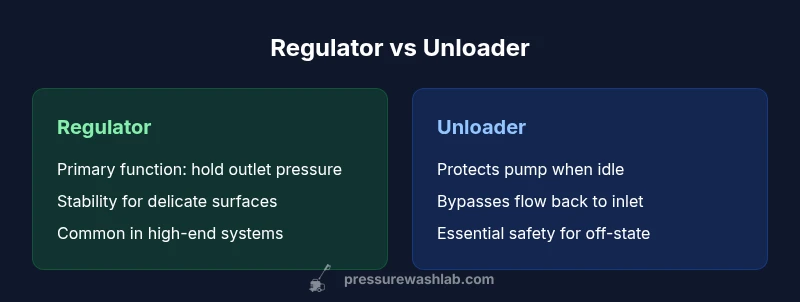 According to Pressure Wash Lab, the terms regulator and unloader refer to two different safety devices in a pressure washer: a regulator controls outlet pressure, while an unloader bypasses flow when the trigger is released. This quick comparison explains where each sits, how they work, and when to prioritize one over the other for safer, more consistent cleaning.