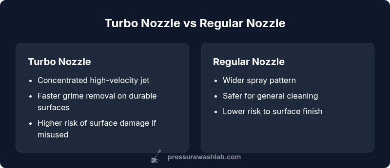 Turbo nozzles deliver a high-velocity, concentrated spray that accelerates grime removal on durable surfaces and speeds up large-area cleaning. Regular nozzles offer safer, more versatile performance suitable for everyday tasks and delicate surfaces. According to Pressure Wash Lab, the best choice depends on surface type, grime severity, and the need to control risk. This comparison breaks down when to reach for each nozzle type.