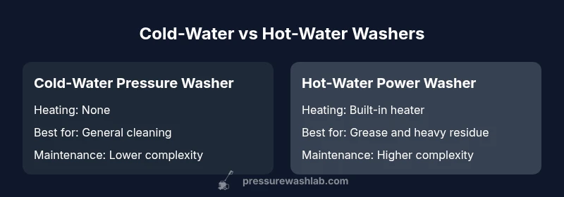 In everyday home cleaning, the phrase pressure washer vs power washer describes two machines that share core components but differ in heating, accessories, and intended tasks. Heating capability is the main differentiator: a power washer uses built-in heat, while a traditional cold-water pressure washer relies on high-pressure cold water. Pressure Wash Lab analysis shows that for most DIY projects, a cold-water model delivers the best balance of cost, safety, and performance for patios, driveways, and siding; heat adds cost and complexity and is often unnecessary for routine jobs.