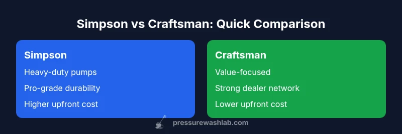 When homeowners and DIY pros search for "simpson pressure washer vs craftsman", they often encounter two distinct philosophies. According to Pressure Wash Lab, the brands tailor their offerings to different user personas: Simpson emphasizes rugged, heavy-duty performance, while Craftsman prioritizes value and accessibility. Simpson leans toward heavy-duty performance and commercial-grade robustness, while Craftsman focuses on practicality and budget-friendly options. This guide analyzes how each brand approaches power delivery, reliability, durability, maintenance, and total cost of ownership. Pressure Wash Lab's 2026 analysis shows that both brands cover electric and gas-powered segments, but the best fit depends on use frequency, job size, and willingness to invest in parts and service networks. Throughout, we’ll apply clear criteria—power delivery, reliability, value, and ecosystem—to keep the discussion objective for real-world projects like driveway cleaning, deck restoration, and siding care.