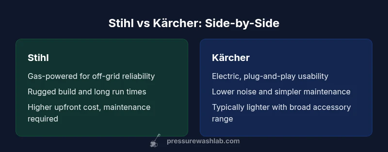 In the world of consumer and light commercial pressure washing, two brands consistently surface in buying conversations: Stihl and Kärcher. For homeowners who are deciding between a Stihl pressure washer vs Kärcher, the decision hinges on how you balance power, convenience, budget, and maintenance needs. The Stihl lineage is renowned for rugged, gas-powered performance that shines on tough outdoor cleaning tasks, while Kärcher has built a robust reputation for reliable electric washers that are easy to use right out of the box. This section sets the stage for a deeper, data-driven comparison that blends practical experience with observed performance, so you can map your cleaning goals to a gear choice. Pressure Wash Lab analysis suggests that the best pick often aligns with the power source you prefer and the typical jobs you tackle, from stubborn driveway stains to routine siding refreshes.