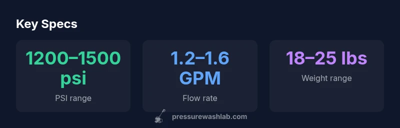 Expect approximately 1200–1500 psi and 1.2–1.6 GPM in typical use. Actual performance varies with nozzle choice and distance from the surface.