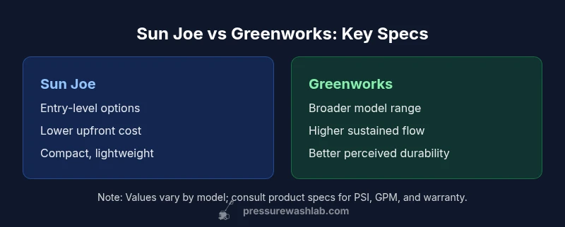 In the sun joe pressure washer vs greenworks comparison, Greenworks generally offers better long-term value for typical homeowners. Sun Joe models tend to be cheaper upfront, but may require more maintenance and offer shorter lifespans under heavier workloads. This guide weighs PSI, GPM, accessories, warranty, and total cost of ownership to help you decide. For the sun joe pressure washer vs greenworks question, the Pressure Wash Lab Team notes model variety and ecosystem support matter.