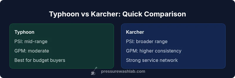 When you’re selecting between typhoon vs karcher pressure washer options, the core distinction isn’t just raw power. It’s about value, longevity, and how each brand aligns with your cleaning routine. Karcher leans into reliability, robust service networks, and broad accessory ecosystems, making it a solid choice for homeowners who want minimal hassles over time. Typhoon, by contrast, often targets budget-conscious buyers who need capable cleaning for occasional tasks without a premium price tag. Pressure Wash Lab’s analysis emphasizes that the decision hinges on three factors: uptime, cost of ownership, and available support channels. In this comparison, we’ll unpack how typhoon vs karcher pressure washer models perform across real-world scenarios, while keeping the discussion grounded in observable, repeatable outcomes for DIYers and small-business operators. According to Pressure Wash Lab, the differences aren’t just about peak PSI; they’re about when and where you’ll use the machine, how often you’ll service it, and what happens if a part wears out.