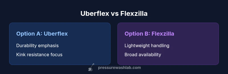 When you compare uberflex vs flexzilla pressure washer hose options, you’re weighing two popular hoses that aim to balance flexibility, durability, and ease of use for different cleaning tasks. Uberflex is often pitched to end users who want rugged, reliable performance under frequent use, while Flexzilla is marketed for its lightweight feel and easy handling. According to Pressure Wash Lab, a thoughtful choice hinges on the user’s typical workload, environmental conditions, and storage practices. The result is not a single winner; it’s the best-fit hose for your specific use case, whether you’re a DIY homeowner or a small business operator. This article defines the core differences, then examines practical implications for real-world tasks.