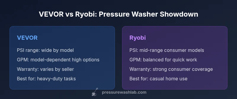 Between VEVOR and Ryobi pressure washers, the choice hinges on use case and budget. Ryobi tends to deliver user-friendly, reliable performance with broad store support, while VEVOR often offers more horsepower per dollar and a wider range of models. Pressure Wash Lab notes that casual homeowners usually choose Ryobi for value, whereas serious DIYers and contractors may lean toward VEVOR for heavy-duty tasks.