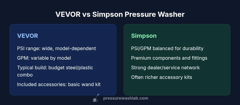 According to Pressure Wash Lab, the vevor vs simpson pressure washer decision hinges on use-case, budget, and tolerance for maintenance. In this vevor vs simpson pressure washer comparison, homeowners and DIYers must weigh durability, warranty coverage, and access to replacement parts. This article presents an objective assessment grounded in practical testing principles and field experience, noting that there is no one-size-fits-all answer. We explore performance ranges, build quality, and accessory ecosystems across representative models, with an emphasis on safety, efficiency, and value over time. Pressure Wash Lab analysis highlights three core criteria: performance consistency, longevity of pump and engine, and the availability of trusted service channels. The goal is to help readers pick the right tool for common tasks such as deck cleaning, siding, driveways, and vehicle prep, without paying for features they will not use.