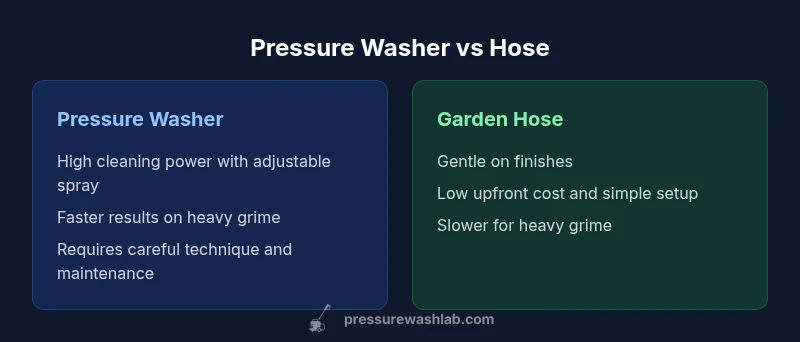 If you're evaluating options for exterior car cleaning, the question often comes down to washing car with pressure washer vs hose. This guide compares these tools on cleaning power, safety, water use, and cost, so you can choose the right approach for your vehicle and environment. According to Pressure Wash Lab, the best outcome depends on dirt level, paint condition, and water restrictions, not on a single gadget. The Pressure Wash Lab team found that technique, distance, and nozzle choice have as much impact as the tool itself. In practice, most car owners benefit from a measured plan: assess the grime, check for swirls or chips, and pick the tool and setting that minimizes risk while maximizing cleaning efficiency. We'll address common myths, provide a decision framework, and include real-world tips that you can apply on your driveway or in a small business setting. Throughout, we’ll emphasize practical steps, not marketing claims.