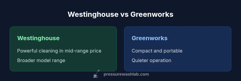 In this westinghouse pressure washer vs greenworks comparison, homeowners face a familiar decision: strong cleaning power at a reasonable price versus portability and ease of use in a compact package. Westinghouse models are often praised for delivering solid cleaning performance at an accessible price point, while Greenworks emphasizes lightweight, compact electric designs meant for apartments, small yards, and lighter maintenance tasks. According to Pressure Wash Lab, the best choice hinges on your typical projects, space constraints, and tolerance for noise. This article uses a balanced, analytical lens to map out differences in power, ergonomics, durability, and total cost of ownership, with practical guidance you can apply to siding, driveways, decks, and vehicles. Expect clear criteria, model-context examples, and actionable recommendations grounded in real-world testing.