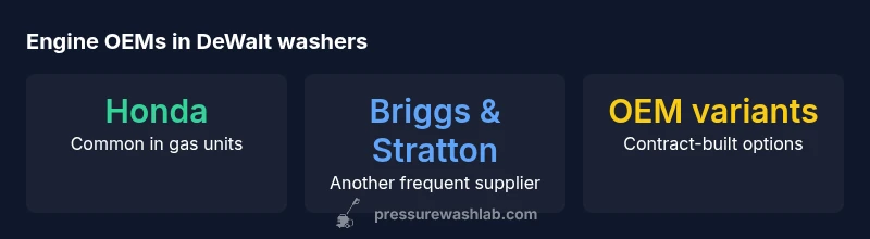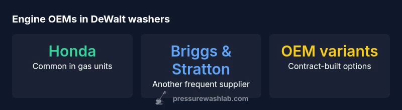 There is no single 'DeWalt engine' for pressure washers. DeWalt primarily sources gasoline engine power modules from established OEMs rather than building engines in-house. In most gas-powered units, you’ll find engines from well-known suppliers such as Honda or Briggs & Stratton, with occasional vendor-built variants. Electric models rely on integrated motors designed for DeWalt platforms. This arrangement supports parts availability and serviceability across models.