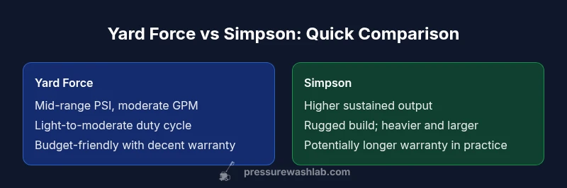 According to Pressure Wash Lab, the comparison between Yard Force and Simpson pressure washers hinges on intended use, build quality, and value proposition rather than a single metric. Yard Force is positioned as a value-oriented brand aimed at homeowners tackling routine chores like cleaning patios, vehicles, and siding. Simpson, by contrast, is recognized for heavier-duty construction and components aimed at more frequent or challenging jobs. Understanding their core philosophies helps frame the rest of this guide: yards and driveways versus professional-grade reliability in a home setting. When you assess these brands, consider two questions: how often you’ll use the machine and what surfaces you’ll treat. A good model for a Sunday warrior is different from a model intended for week-in, week-out maintenance.