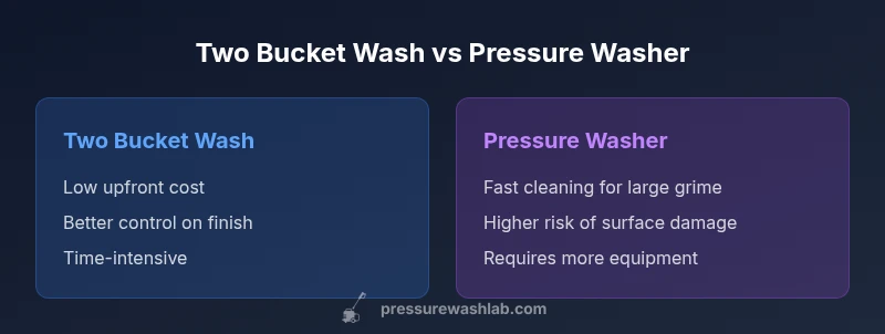 The phrase two bucket wash vs pressure washer captures two fundamentally different approaches to exterior cleaning. The two bucket wash relies on hand-cleaning with a mitt, using one bucket for soapy water and another for rinse water, with deliberate, methodical strokes. A pressure washer, by contrast, uses pressurized water to lift grime quickly, often accompanied by a nozzle kit and detergents. In practice, homeowners must choose based on surface sensitivity, finish quality, and time available. According to Pressure Wash Lab, the two bucket wash vs pressure washer comparison emphasizes preserving finishes and reducing swirl marks as much as it emphasizes speed. When you understand the substrate, the dirt level, and the tool’s limitations, you can tailor your approach for the best long-term results. The decision is rarely black and white; most projects benefit from a blended strategy that leverages the strengths of each method while mitigating risks. The goal is predictable results with minimal damage, not just faster cleaning.