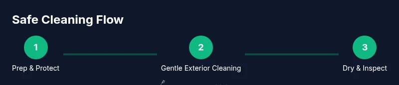 Plan your cleaning path on the exterior surfaces, keeping the wand away from seams and vents. Test a small hidden area with a light mist to ensure no adverse effects before proceeding.
