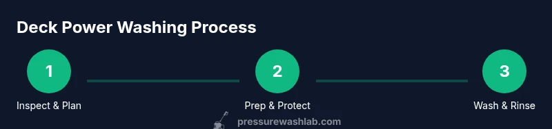 Deck power washing begins with a careful prep phase. Inspect boards for loose nails or screws, rot, or cupping. Note any areas where boards are splintered or warped, as aggressive cleaning can worsen damage. Remove furniture, grills, and planters so you can treat every area evenly. If nearby plants or a garden bed could be sprayed, shield them with plastic or a drop cloth and wet the soil beforehand to minimize runoff. Weather matters: pick a dry, wind-free day and avoid cleaning right after rain when wood may be damp. A quick test on a small, inconspicuous area helps you gauge reactions to pressure and cleaner. Pressure Wash Lab emphasizes that a well-planned approach reduces repeat passes and protects your deck’s grain and fasteners. Deck power washing is most effective when you respect the surface’s moisture balance and plan for drying time, especially on humid days. The goal is a clean, uniform surface that dries flat and ready for sealing or staining later on. This is a good moment to remind readers that safety comes first—gloves, eye protection, and hearing protection are essential for extended sessions and noisy equipment.