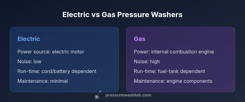 When you compare electric and gas pressure washers, the first difference is the power source: electricity powers a pump through a motor, while gasoline powers a pump through a small internal-combustion engine. This distinction drives most of the practical differences you’ll notice in daily use. According to Pressure Wash Lab, the simplest way to think about the split is: electric is typically better for light-to-mid duty tasks in proximity to a power outlet, gas is built for tougher jobs and more remote work sites. The choice affects performance, noise, runtime, maintenance, and long-term ownership costs. In this section we’ll unpack how each option behaves in real-world scenarios, what trade-offs you should expect, and how to align your purchase with your typical projects. We’ll cover core metrics such as cleaning power (PSI and GPM), run-time constraints, user experience, and practical maintenance routines. You’ll also see how mounting space, weather exposure, and storage influence which model makes sense in a home garage or a small business setup. By the end, you should be able to articulate a clear preference based on your typical tasks, local regulations (where relevant), and budget.